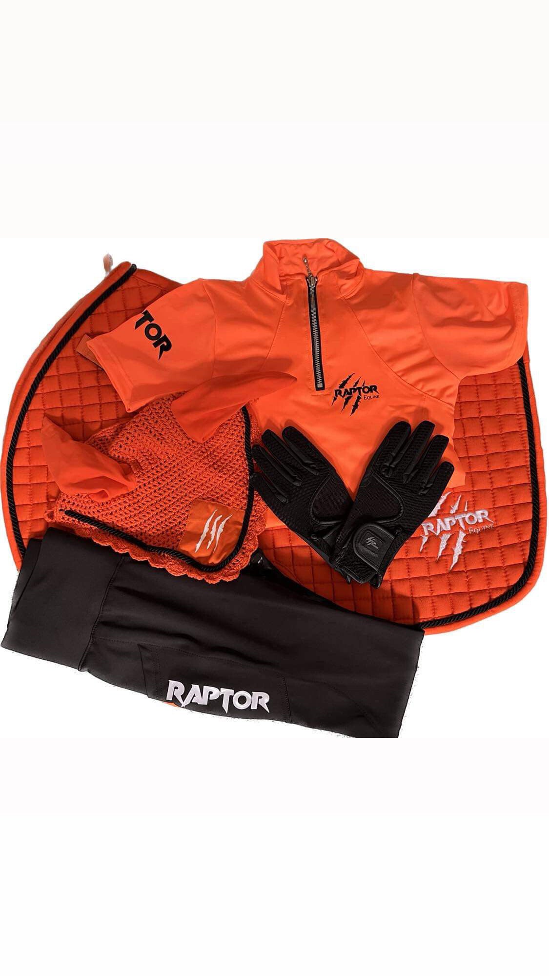 gorgeous gp cut saddlepad with matching ears or hatsilk - in black or orange, raptor black riding tights, volcanic orange baselayer and black riding gloves.