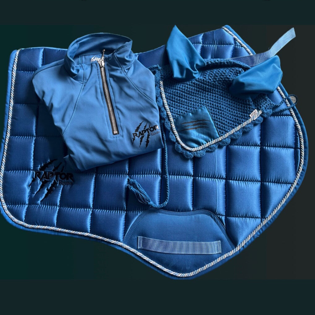 Stand out from the crowd in our gorgeous set. Black riding tights, alpha blue baselayer and saddlepad.